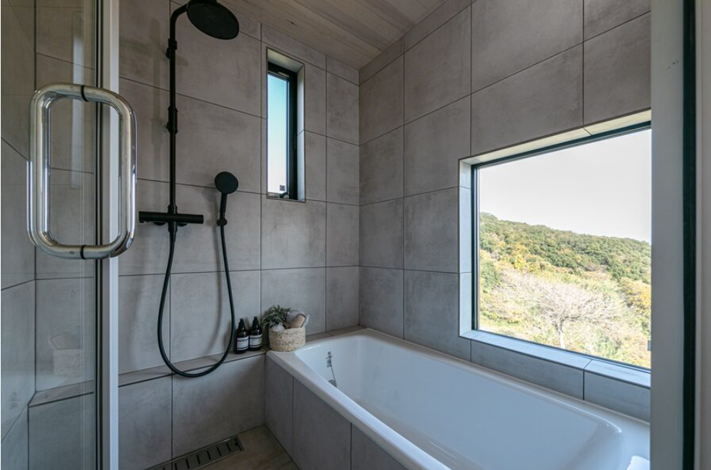 体の芯まで温まる鋳物ホーロー浴槽とスペインタイル「バルドーサ」マットブラックのオーバーヘッドシャワーでシンプルに仕上げた造成浴室。