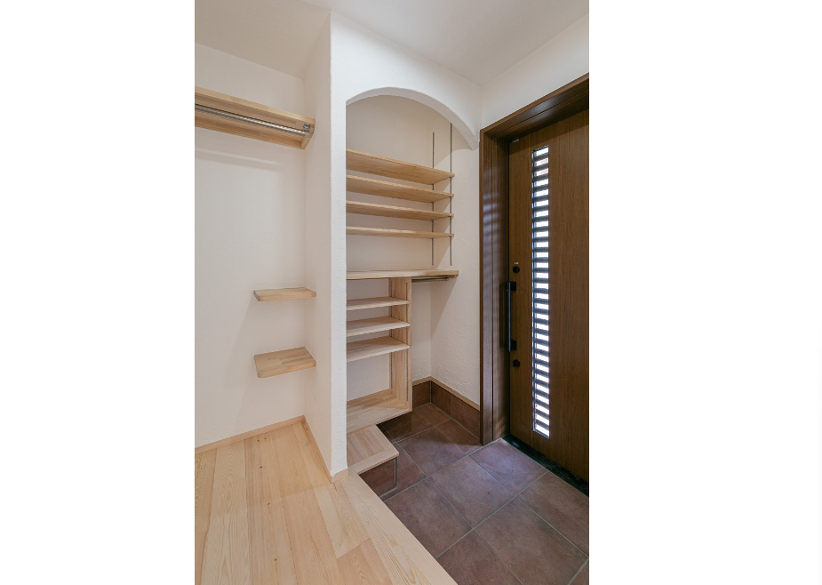 玄関にはカスタマイズされた造作収納。 アーチ壁の向こうにロールスクリーンを取り付ければ、通気しながら目隠しができます。