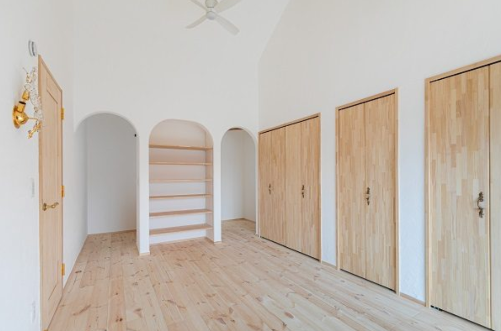 主寝室の三つのアーチ。 真ん中の書棚を挟んで左右にご夫婦それぞれのワークスペース(書斎)を設けました。