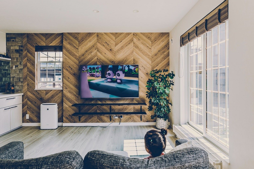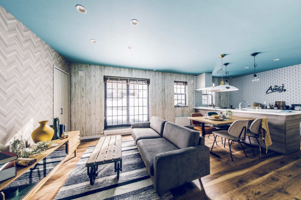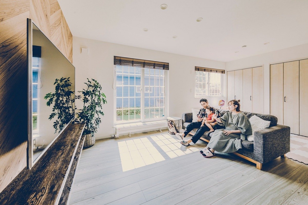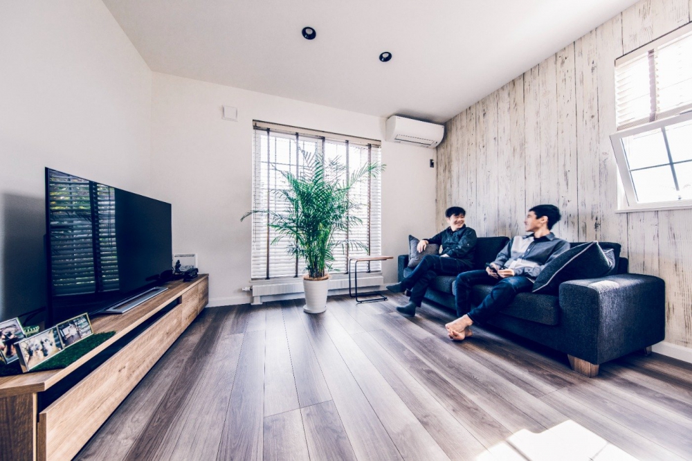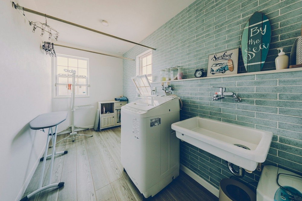 『自由にコーディネートしたサーファーズハウスができました』アメカジ工務店の魅力は、照明・カーテン・壁紙などが豊富に選べて、自由度が高い家を造れること。ヘリンボーン柄やブルーの壁紙で、リビングにはサーファーズハウスの雰囲気を取り入れました。念願だった壁掛けTVも実現できて、嬉しいですね。妻は、洗濯物を干したユーティリティスペースに来客を通すのが嫌で、専用の部屋が欲しいと言っていて。