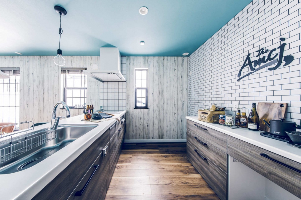 『ガレージのおかげで、新たな趣味が増えました』ガレージ以外の内装は、妻の希望で、全体的に明るい雰囲気にしました。コーディネートでいちばん悩んだのは、壁紙選びでしたね。オープンハウスでレンガ調のクロスを使っていて、カッコいいなと印象に残っていたから、キッチンの背面にアクセントで取り入れました。アメカジならではの、塗装したカラフルなドアや、イエローのキッチンも気に入ってます。明るいキッチンで料理をすると、気分が上がると妻も喜んでいます。
