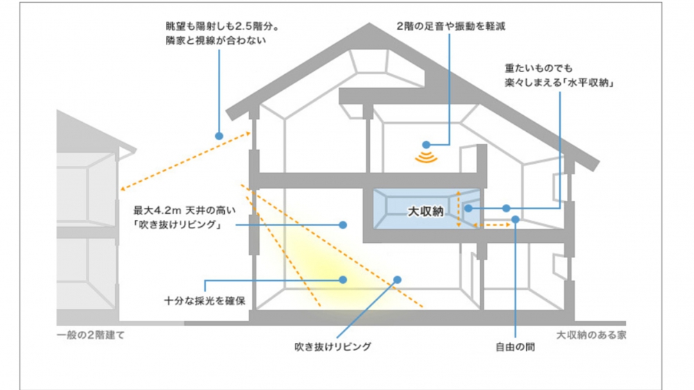 「大収納」の天井高は最高1.4m。1階と2階の間に設けるので、その分リビングの天井が高くなり、のびやかな吹き抜け空間が誕生します。通常の住まいでは、収納スペースを大きくすると床面積として換算され居住スペースが犠牲になることもありますが、大収納スペースは高さ1.4m以下、床面積は2階床面積の1/2未満であるために居室とみなされません。容積率にも参入されないため、定められた容積率をめいっぱい使って大容量の収納を確保できるのです。