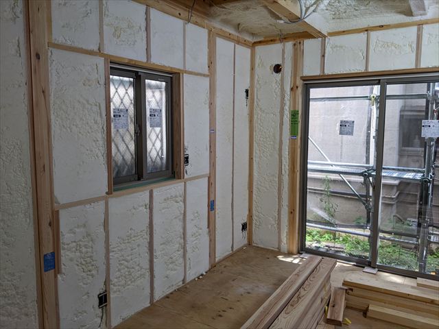 現場吹付の硬質ウレタンフォーム「Kフォーム」の断熱材は、構造躯体に隙間なく充填されるため、気密性・断熱性が高く、真夏の酷暑や真冬の冷え込みにも外気温の影響を受けにくく、365日・24時間、家中快適です。