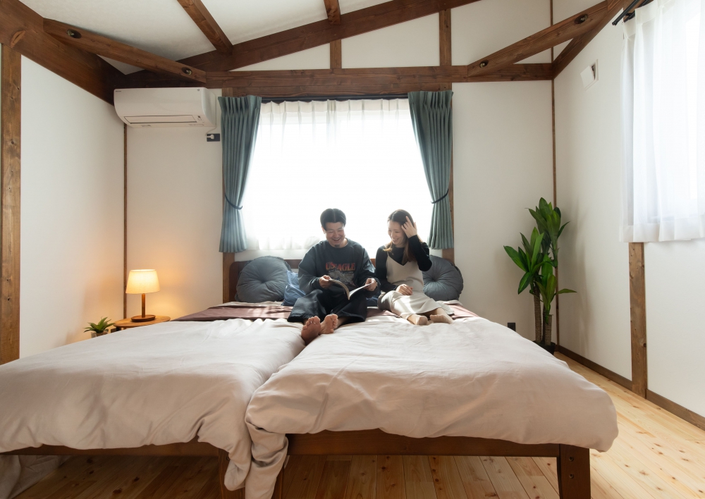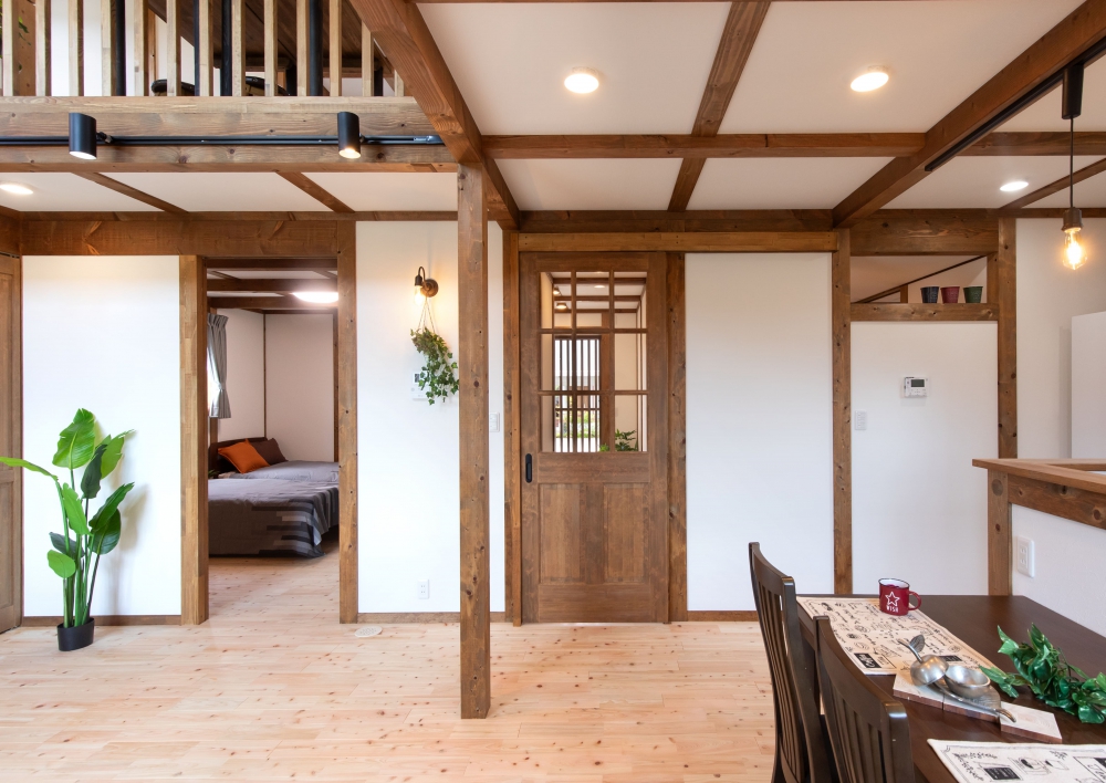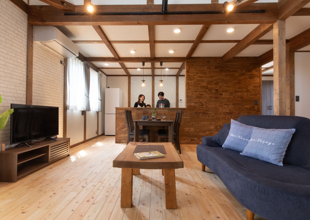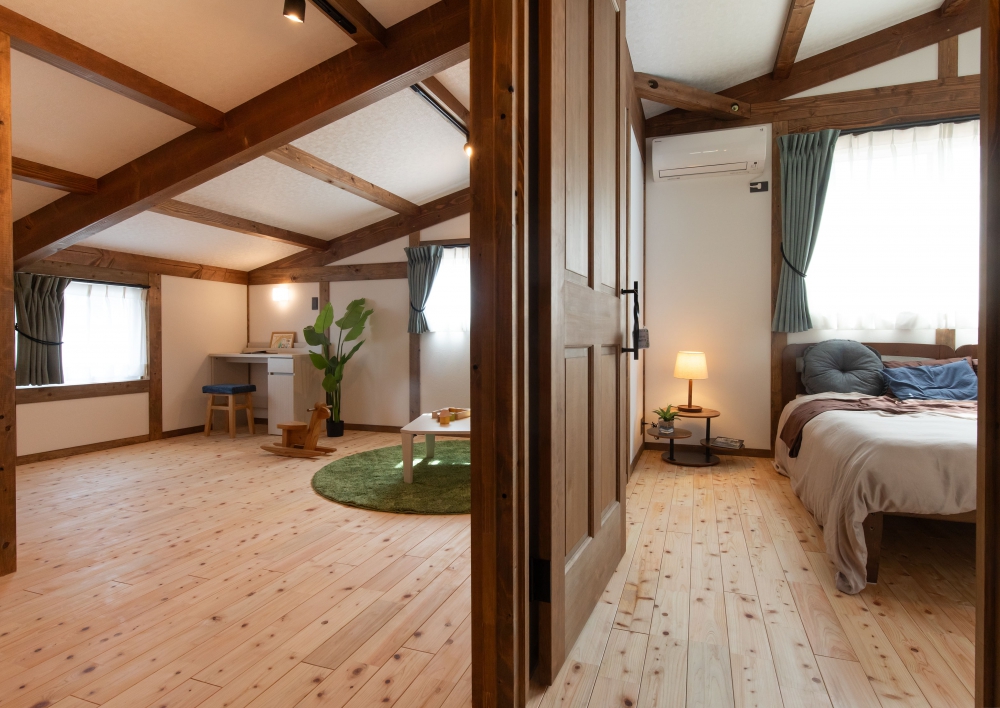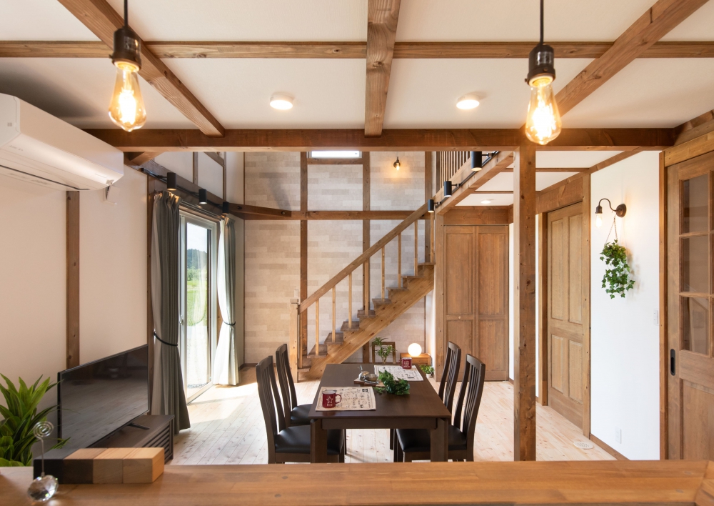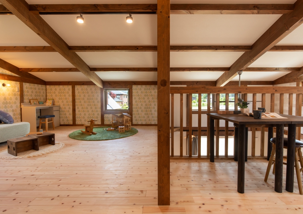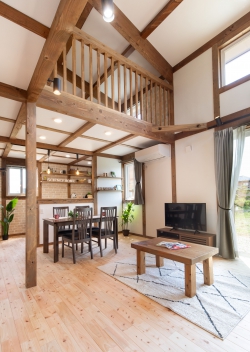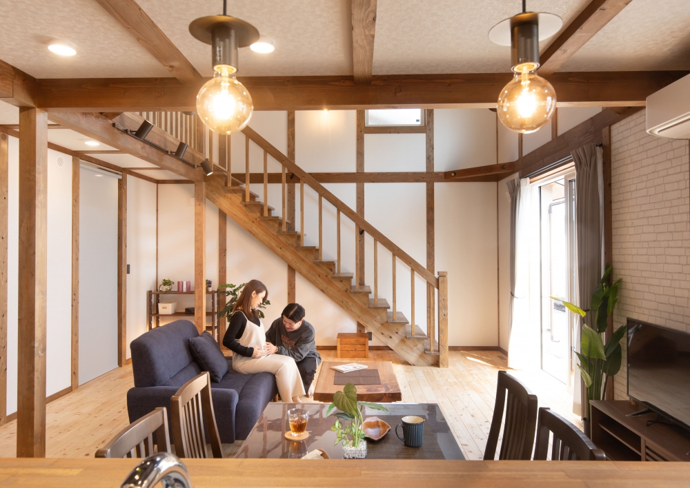 柱や梁などの構造材が現しになった日本の伝統工法「真壁づくり」。木を「見て」「触って」「感じる」ことができる室内は、温もりとやすらぎに包まれ、とてもリラックスできます。