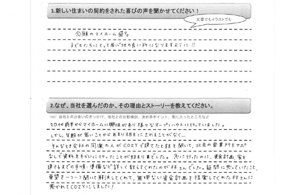 急に行ったのに、資金計画、家を建てるまでの手順、準備などを詳しく教えてくれたのが林さんでした。疑問に思っていたこと、要望を1つ1つ聞いて解決してくれて、無理ない資金計画を提案してくれた林さんに惹かれてCOZYにしました!