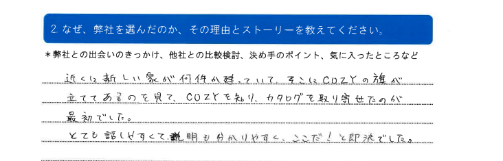 近くに新しい家が何軒か建っていて、そこにCOZYの旗が立ててあるのを見て、COZYを知り、カタログを取り寄せたのが最初でした。とても話しやすくて、説明も分かりやすく、ここだ!と即決でした。