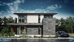 リゾートホテルのようなモダンな外観。屋根には太陽光発電システムも搭載しており、「電気自動車にしたこともあり、太陽光発電はとても役立っています」と嬉しいお言葉もいただいている。制振システムも採用された、安心な家である。