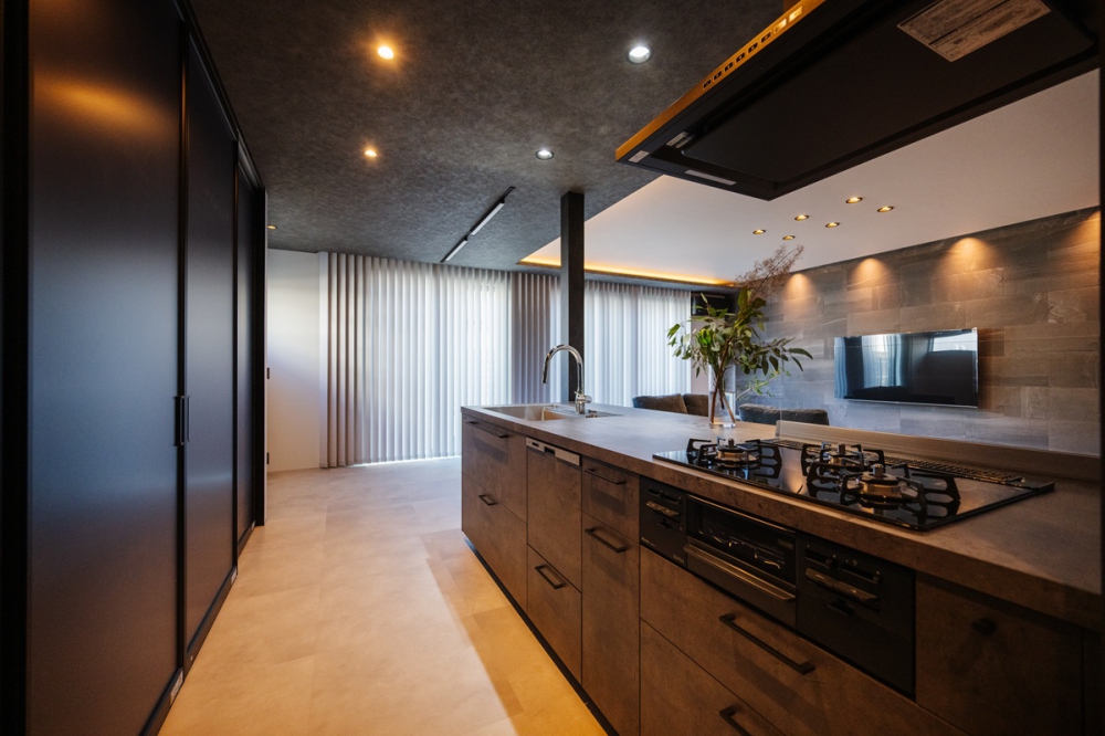グレーのタイルやウォルナットの木材を取り入れたインテリアで引き締めています。