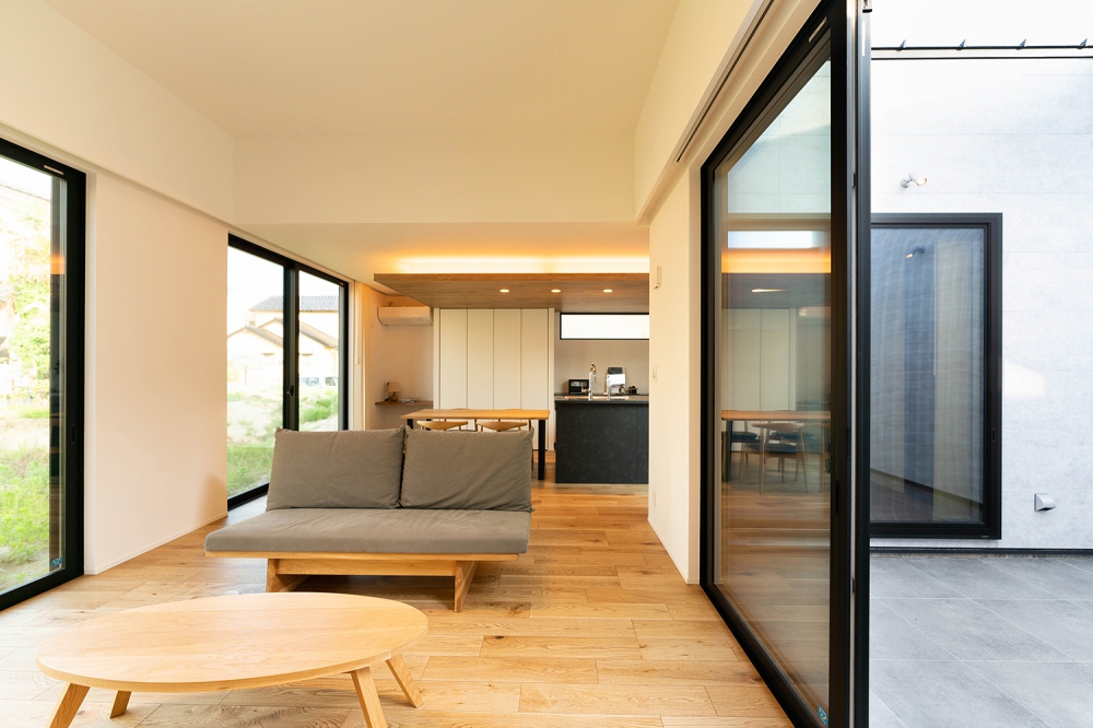 ガラス扉により、視線が抜け広がりを感じるリビング空間。感覚的な空間の広さを確保しつつ、暖かく過ごせる