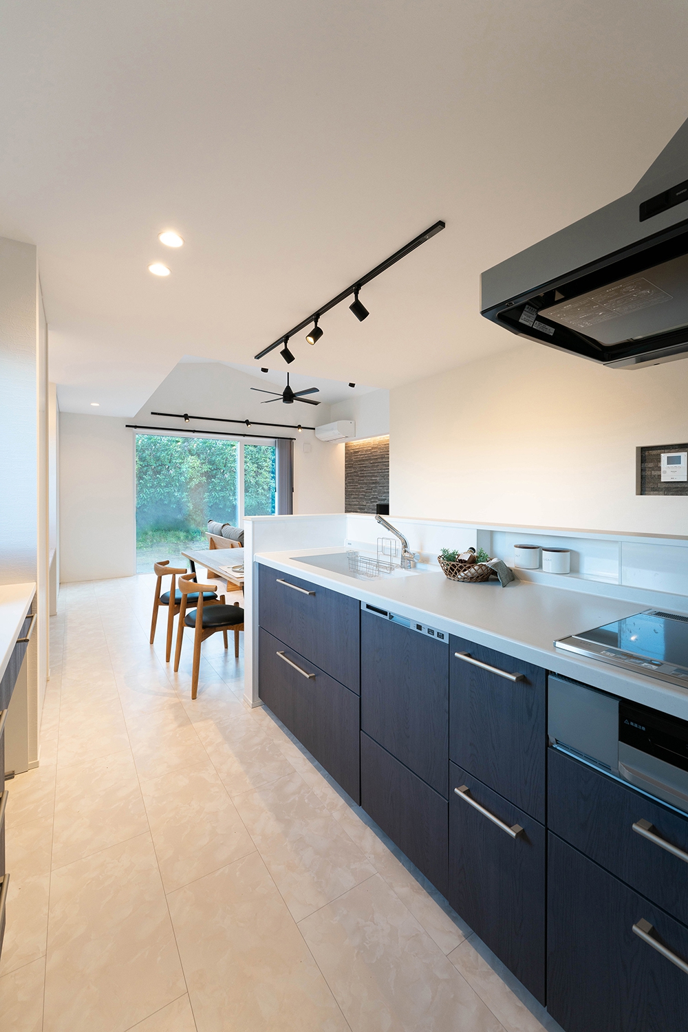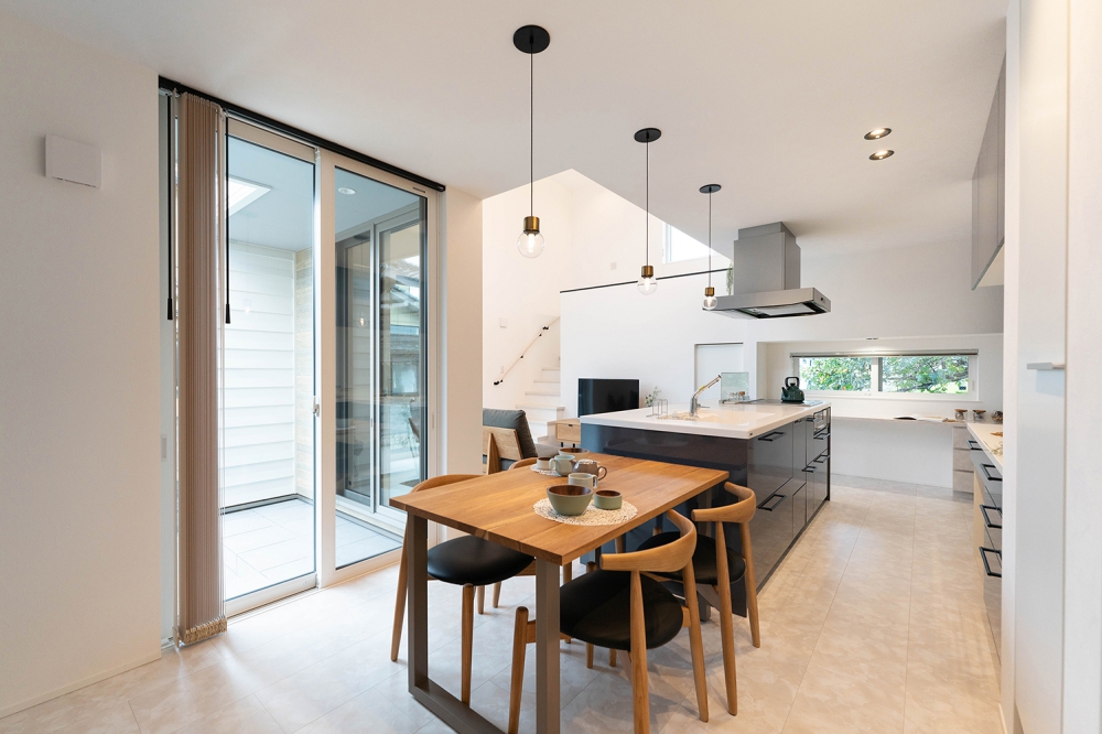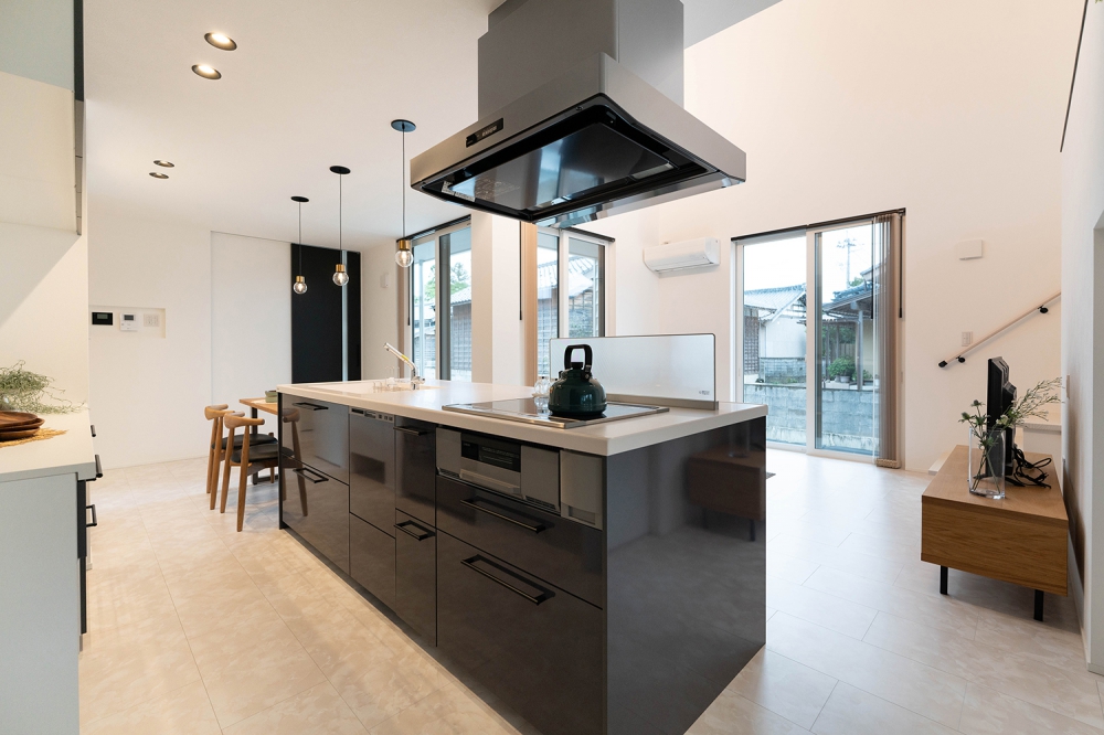 アイランドキッチンにし、ぐるりと回れるようにした。奥にはテラスが続き、室内外が一体となるような設計で、日常の中に豊かな時間をもたらす