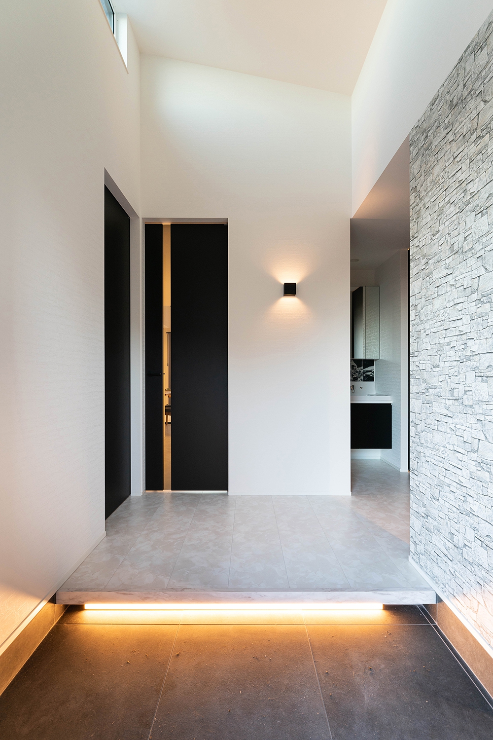 玄関にはアクセントクロスと間接照明にてお客様をお出迎え。モノトーンでまとめたスタイリッシュな空間