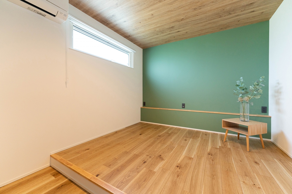 テーマカラーであるグリーンのクロスを一面に使用した小上がりの寝室