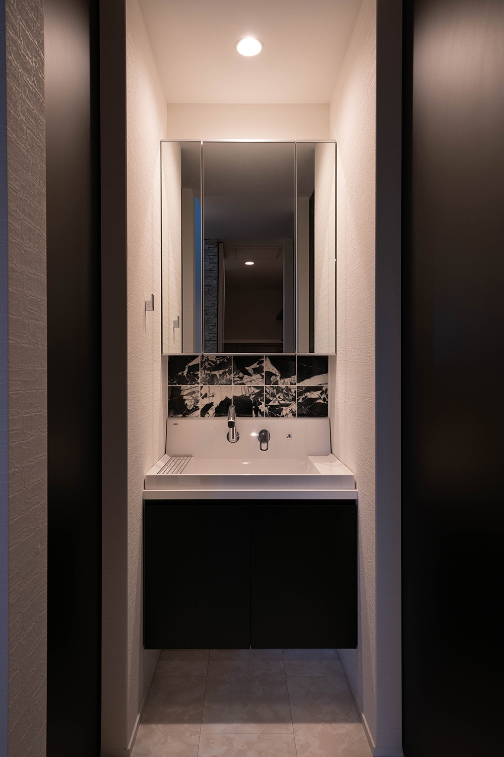 コンパクトにまとめた造作洗面化粧台。ここにもモノクロタイルを採用し、シックな印象に