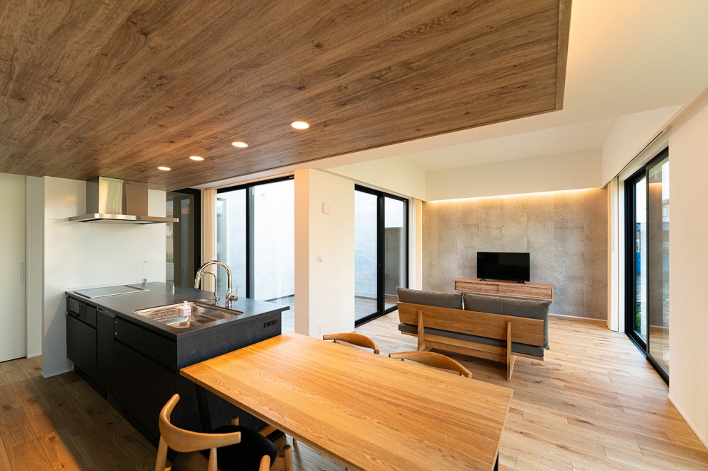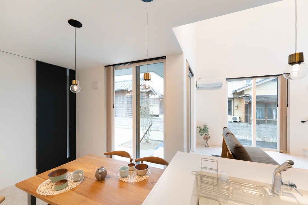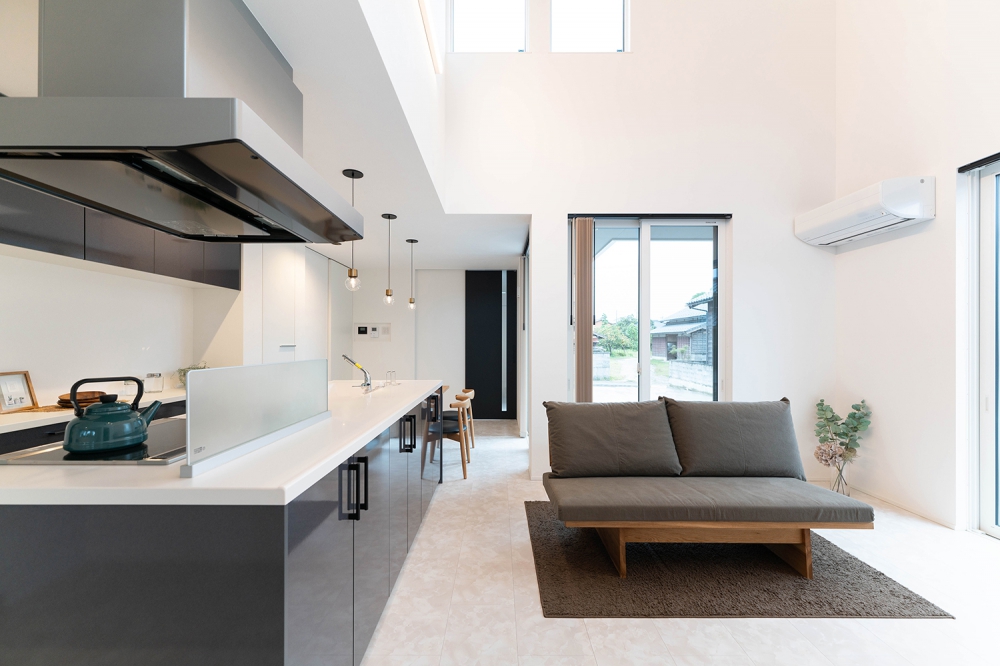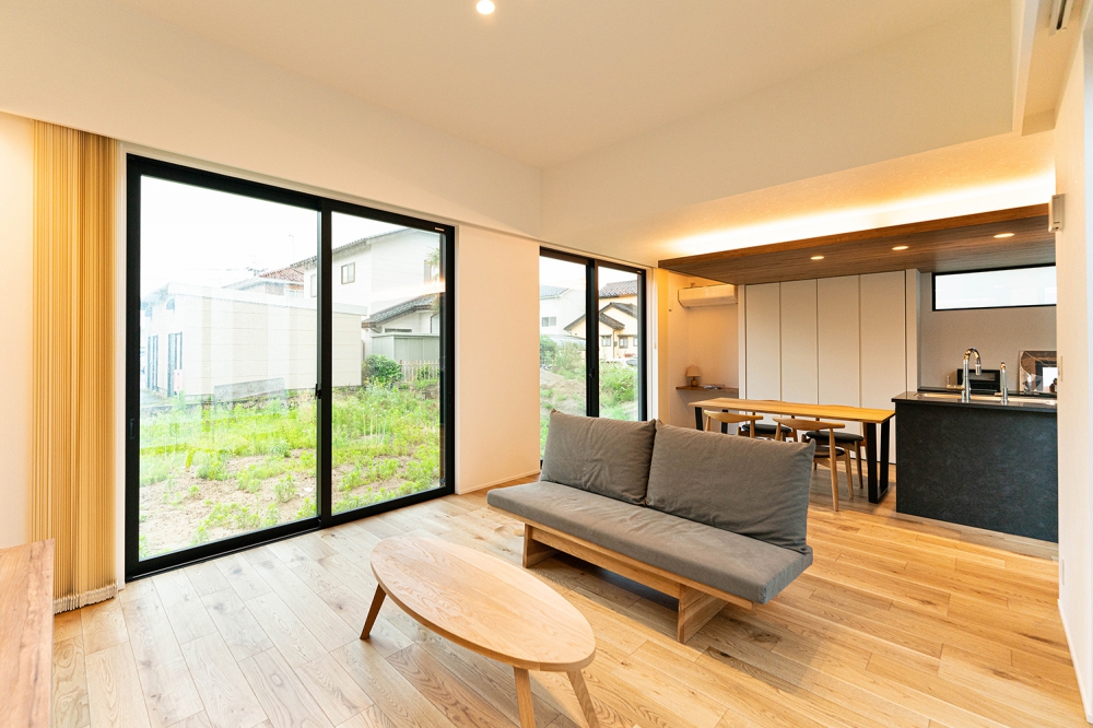 キッチンを中心としたL型のLDKは、2面の大開口サッシから採光をとることで、明るく開放感のある空間に