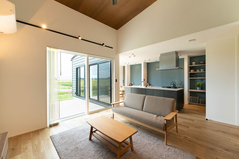 勾配天井と現し梁で、縦の広がりを演出したリビング空間。木の温もりとシンプルな美しさが調和する、心地よい暮らしの中心に