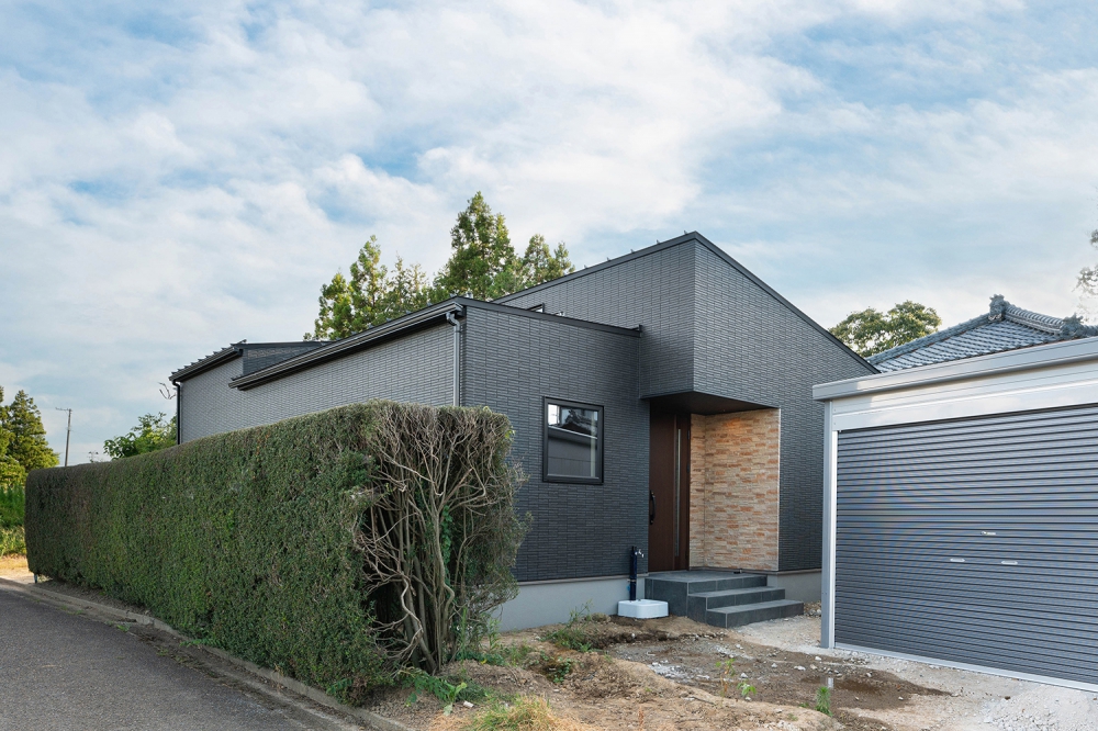 外壁はベースとして黒の窯業系と玄関には石の立体感のあるモエンアートを採用