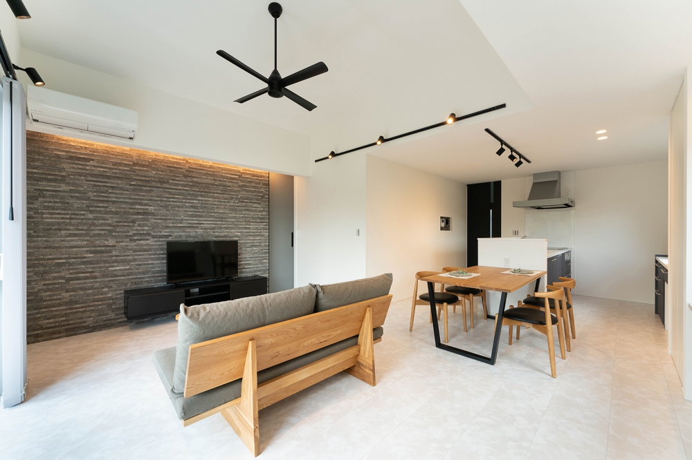 シーリングファンや、照明、扉などにアクセントとなるブラックを使用。空間を引き締めている