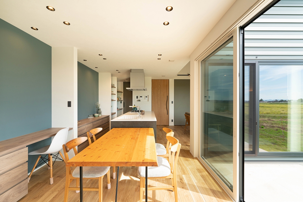 田園風景を望む立地を考えゾーニングし、LDKには吹抜を設け開放感のある空間に。
