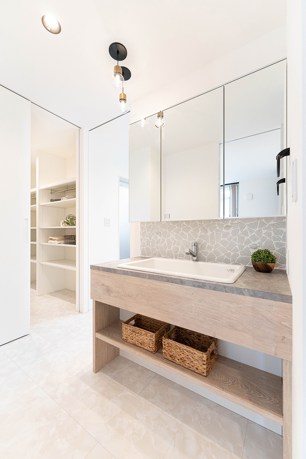 木目がアクセントになっている洗面の横には、容量たっぷりの収納スペースを設けて機能面も追求