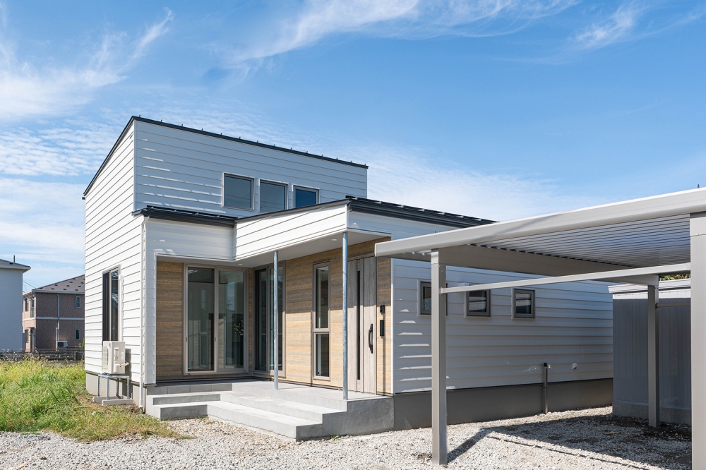外壁は室内のベースカラーと同じホワイト・グレー・オークの3色でまとめ、内外に統一感をもたらす。柔らかい印象になりすぎないよう、窓枠・屋根・軒天・水切り等にブラックを使用し引き締める