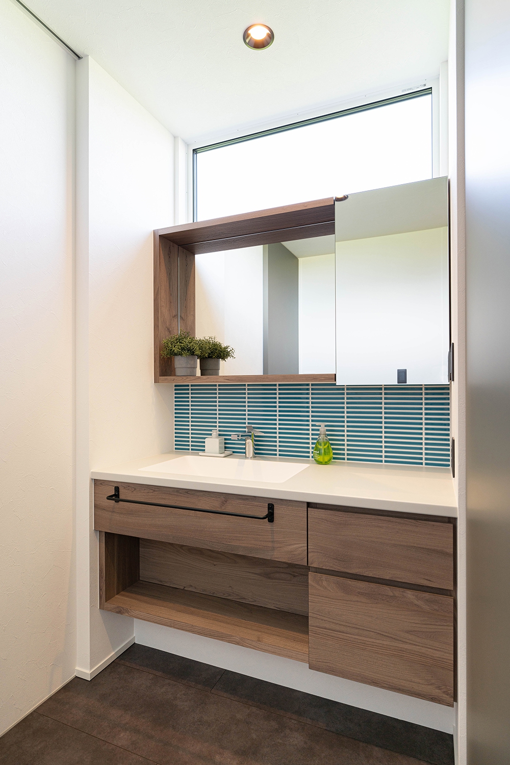 爽やかなブルーグレーのタイルと木の質感が彩る造作の洗面化粧台