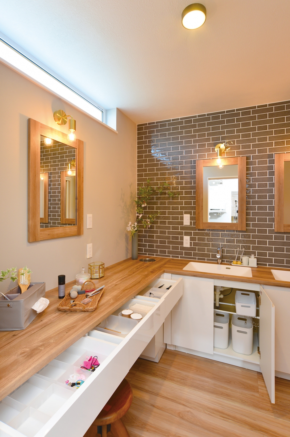 メイクやヘアセットができるワイドな洗面台。鏡も大きく、手元が見やすいので朝の身支度も捗ります。