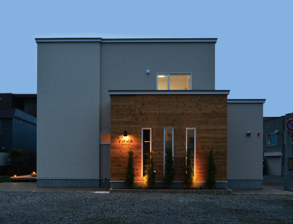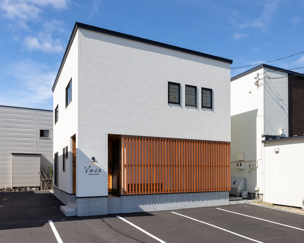 明るい外壁材とポーチ部分には道産の木貼りを施したナチュラルな外観。