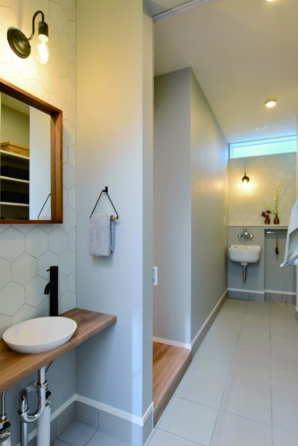 ホールの手洗い場は、タイルにボウルに照明などこだわりがつまった空間。