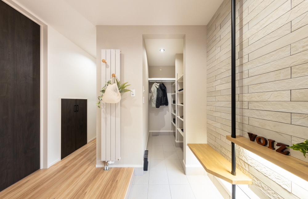 明るく清潔感のある玄関まわり。土間続きの収納で家族の靴もすっきり。