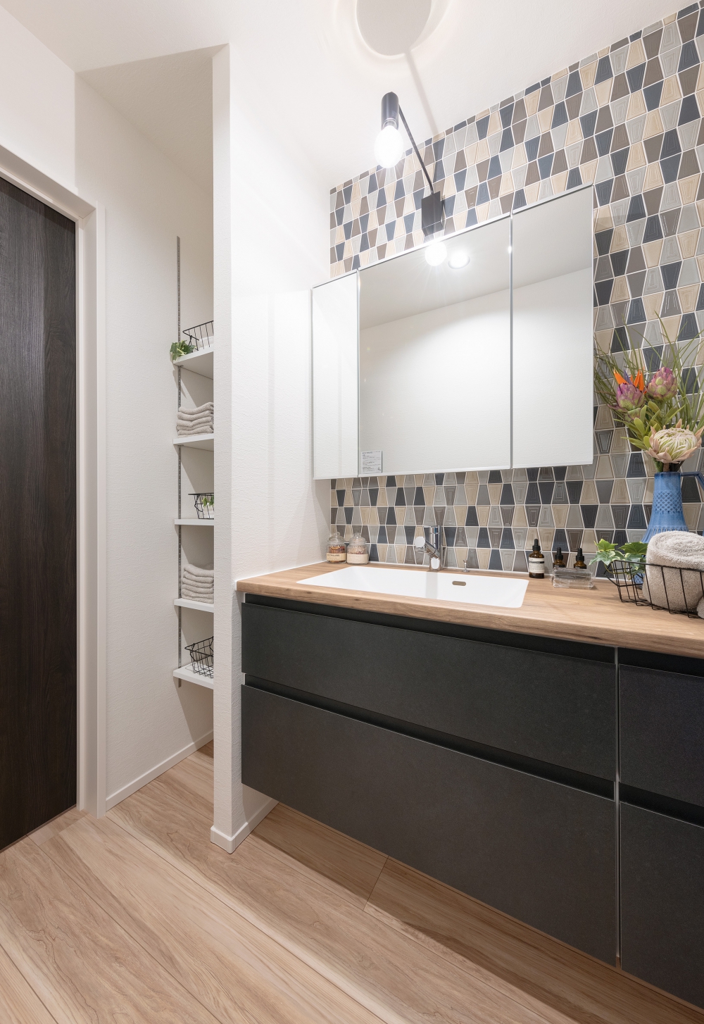 レトロなモザイクタイルと木目がマッチした洗面。ワイドなサイズで広々使えます。
