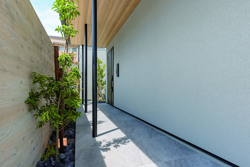 敷地の間口を生かし、木目調の軒裏をアクセントに目を引く外観に仕上げました