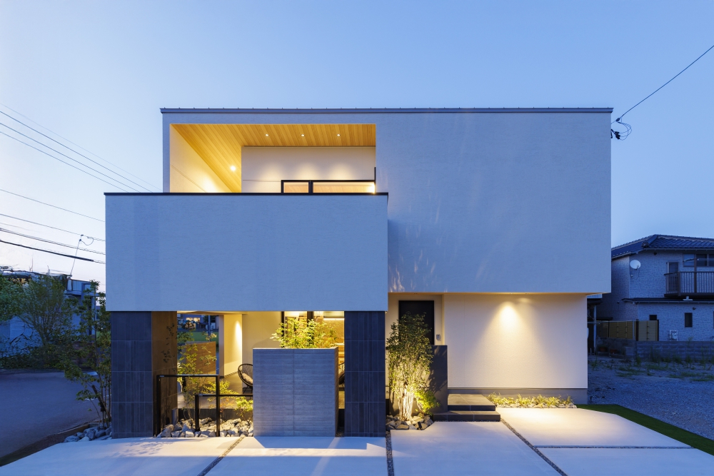 間口の広い土地を活かし、インナーガレージで迫力のある外観にまとめました。