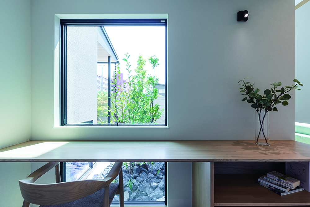 LDKのDEKA窓からは田園風景を眺めることができ、季節の流れをいち早く感じることがでます。 また、窓の開口部分を広くすることでよりLDKの広がりを感じられる工夫をしています。