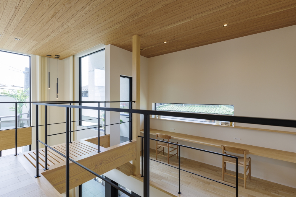 吹抜け階段を上がった先にはカウンター付きのフリーコーナー。