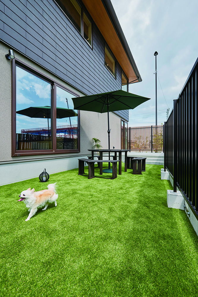 大きな中庭でBBQや大切な愛犬オードリーちゃんを遊ばせ走らせたりできる家族が一緒に快適に楽しめる空間は萌えポイントです。