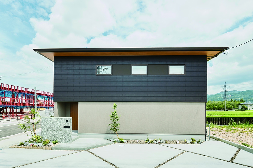 片流れの総2階風の外観でまとめました。正面の壁にはガルバリウムを貼り、スタイリッシュな外観に。