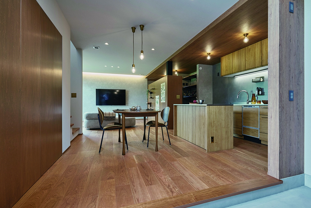 木やタイルの素材を組み合わせたオリジナルのインテリア。