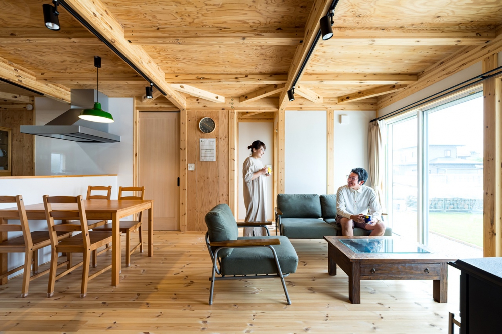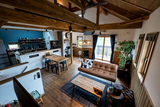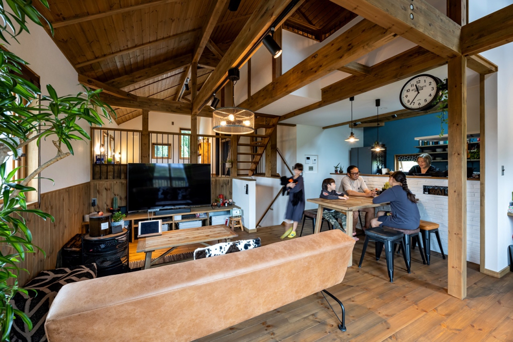 1.5階のLDKは吹抜けで、板張りの天井は標準仕様。自然素材のナチュラル感と見えるところ全部が板張りのリッチ感がたまらない。ソファにゴロンとして天井を見上げると「本当にこの家を建てて良かった」と心が温かくなるという。ヴィンテージテイストの塗装は落ち着いた雰囲気を漂わせ、ご夫婦の好きなインテリアによくマッチしている。モノが多い中にもこだわりを感じ、本当に好きなモノしか欲しくないという信念が伝わってくる