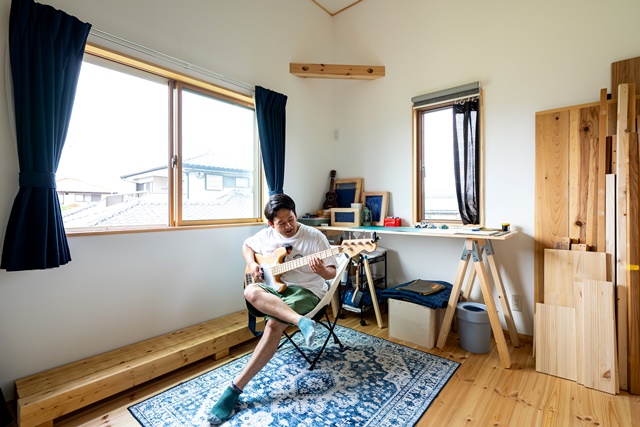 2階の洋室も天井が高く、実際の広さより開放的に感じる。趣味の音楽を楽しんだり、DIYで作る棚の計画に没頭する時間が好きだ。吹抜けのリビングのオープンなところと、個室のプライベート感いっぱいの良いとこどり。今日はいつもよりいい音を奏でられる気がする