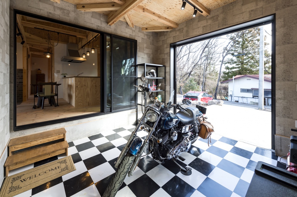 インパクトのあるチェッカー柄の床に愛車が映えるアウトドアストッカーは、ご主人の秘密基地だ。「この家を建てることを考えた時に、ガレージと薪ストーブはマストだった」と話すご主人。休日はついつい時間を忘れてバイクいじりにのめり込んでしまうそう。夜はリビングで寛ぎながら、愛車を眺められるのも楽しみである。