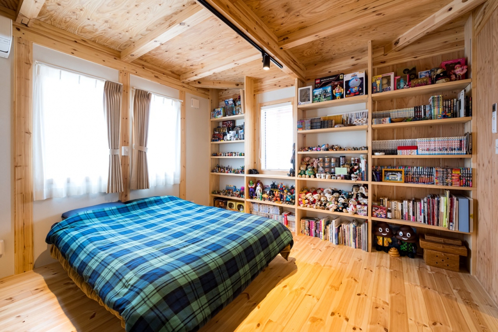 2階の洋室は、天井が高いので部屋がとても広く感じられる。アクセントクロスとウッドブラインドが、カッコよさとカントリーな雰囲気を演出してくれた。朝起きて、素足で触れる無垢の床は本当に気持ちがいい。日に当たっていない場所も、経年で徐々にあめ色に変化してくるのが木の家の楽しみなところだ