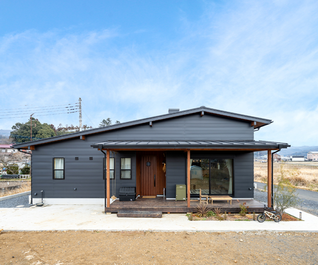 ブラックのガルバは横張り。リビングと繋がるウッドデッキにかかる大きな軒が特徴的な外観だ。のどかな景色の中に凛と建つ平屋は、謙虚な気持ちでそこに居るのに存在感が際立ってしまう。観念するしかない。自然を愉しむ暮らしには、無垢材のウッドデッキが欠かせないだろう。メンテナンスは家族のイベントとして定期的に行うのだが、子どもも一緒に作業することで家への愛着が増している。長年住む家だから、家族全員で可愛がってあげたい