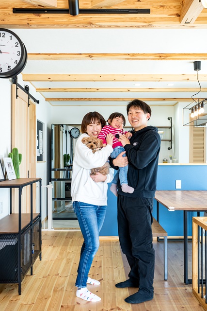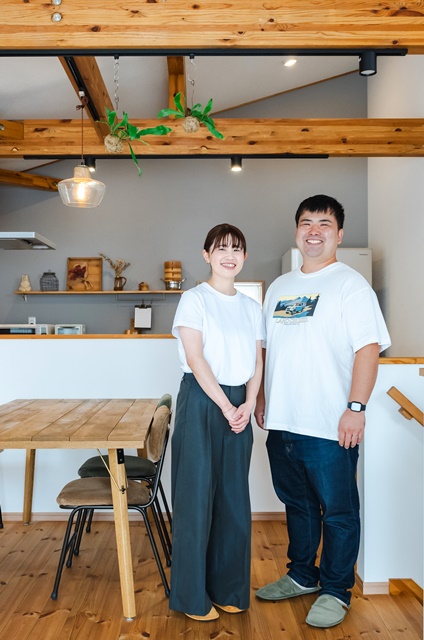 ご主人様の仕事がテレワークと併用の為ワークスペースが欲しかったのと、釣りが趣味で道具が多いので収納するガレージがマストだった。ご夫婦ともに木の雰囲気が好きでログハウスも検討したが、BinOの規格住宅を知って、沢山あるプランの中から自分達の理想の暮らしにピッタリだと思い、弊社に決めた
