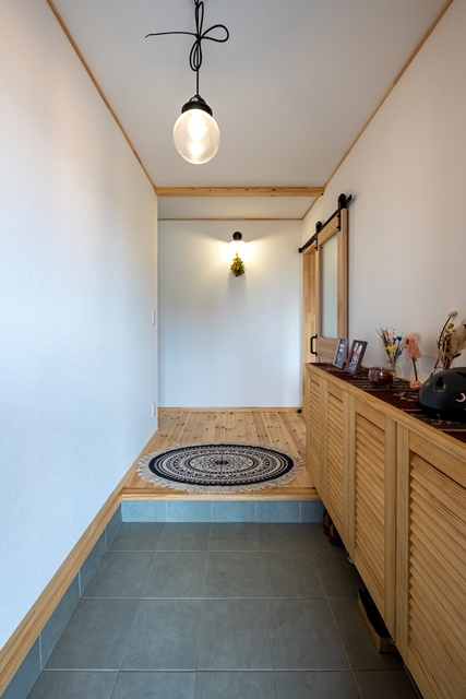 玄関正面のアクセントクロスは優しいブルーをチョイス。リビング入り口の無垢の扉はネイビーに塗装した。壁面には家族写真が飾られていて、通るたびに微笑ましい気持ちになる。下駄箱も無垢なので、パインの床と同様こちらも経年で色づいてくるのが楽しみ。人が暮らすからこそ付く少しの傷や汚れは、思い出や成長がカタチになって現れるものである。それをも楽しめるのは最高のボーナスだ