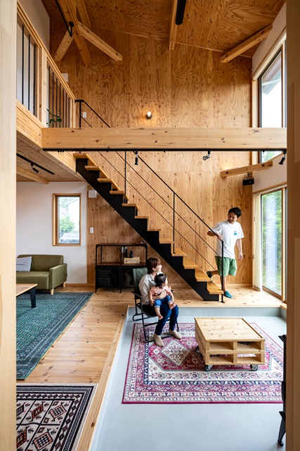 平屋のように暮らせるLOAFERは家族がちょうどいい距離感でいられる設計。プライバシーを保ちつつ、気配を感じて安心出来るのが良い。S様邸は土間リビングに薪ストーブを設置し、一緒にいるのが心地よいスペースとなった。広い敷地の外構工事は、薪小屋やウッドフェンス・駐車場など、建築段階から打ち合わせしていたことに加え、暮らしながら少しずつ自分たちで作り上げていく楽しみを残した