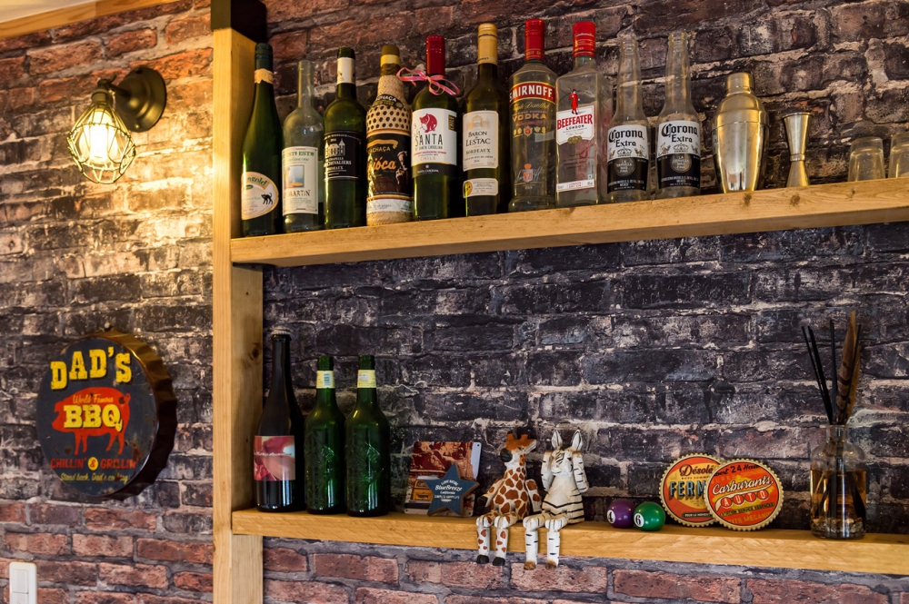 2階のフリースペースには、DIYでバーカウンターを作った。好きなお酒を並べて音楽を聴いたら、自分だけの時間の始まり。レンガ調のアクセントクロスとノスタルジックな灯りのランプが、雰囲気とマッチしている。リビングとも繋がることで、お互いに好きなことをしながら気配も感じられ、ちょうどいい距離感で一緒に居られるのだ