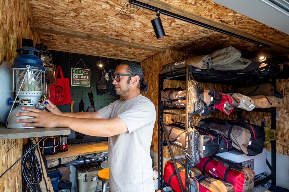 「家を建てるなら、絶対ガレージが欲しかった」とご主人様。シャッター付きのアウトドアストッカーは、外からだけでなく寝室からも出入り出来るように、テラスドアを採用した。雨の日でも心配ないのと、夢のスペースでいつでもうっとりすることが実現した。ストッカーいっぱいに並んでいるのはキャンプ道具。全てこだわりの一流品だが、惜しむことなく家族でのキャンプにベビーユーズしているという。テントにタープ、ランタンに工具…撮影しているこちらまで楽しくなるスペースだ