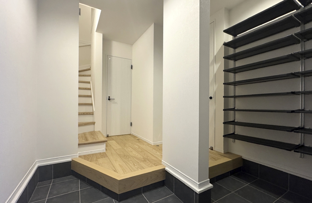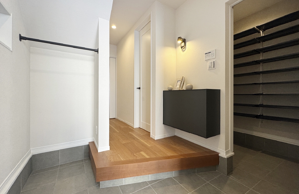 玄関前には目隠しの壁を設け、道路からの視線を気にせず安心して過ごせるように配慮しました。玄関内にはたくさんの靴をしっかり収納できるシューズクロークがあり、さらにすぐ近くにハンガーパイプを設置。コートなどをサッとかけられるので、お出かけの際もスムーズです。