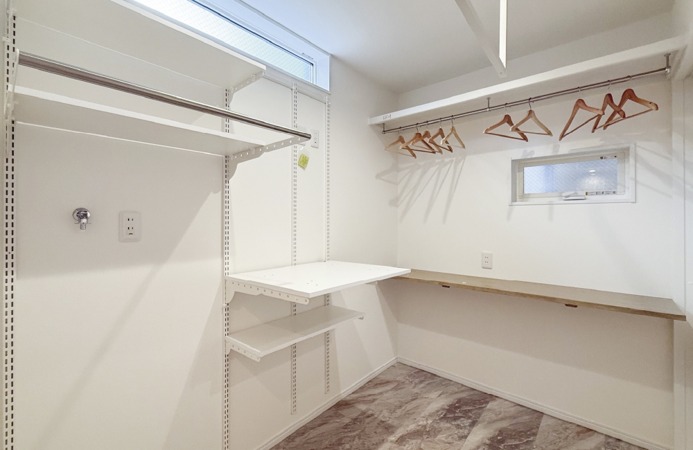 ご夫婦の衣類や小物類をはじめ、スーツケースのような大きなものも収納できるウォークインクローゼットを設けました。この広々とした収納スペースにより、室内をスッキリと快適に使うことができます。また造作のカウンターは、書斎スペースやドレッサーなど多目的に活用できます。