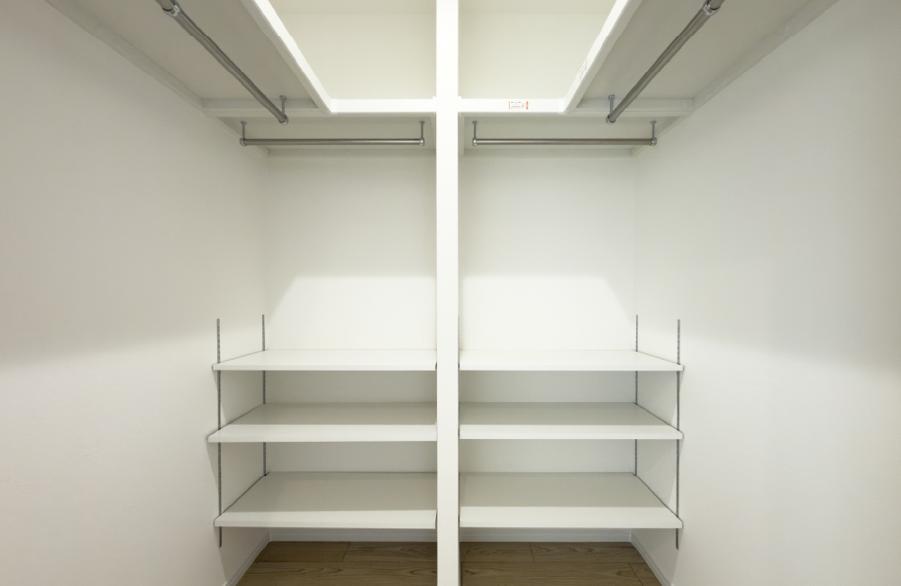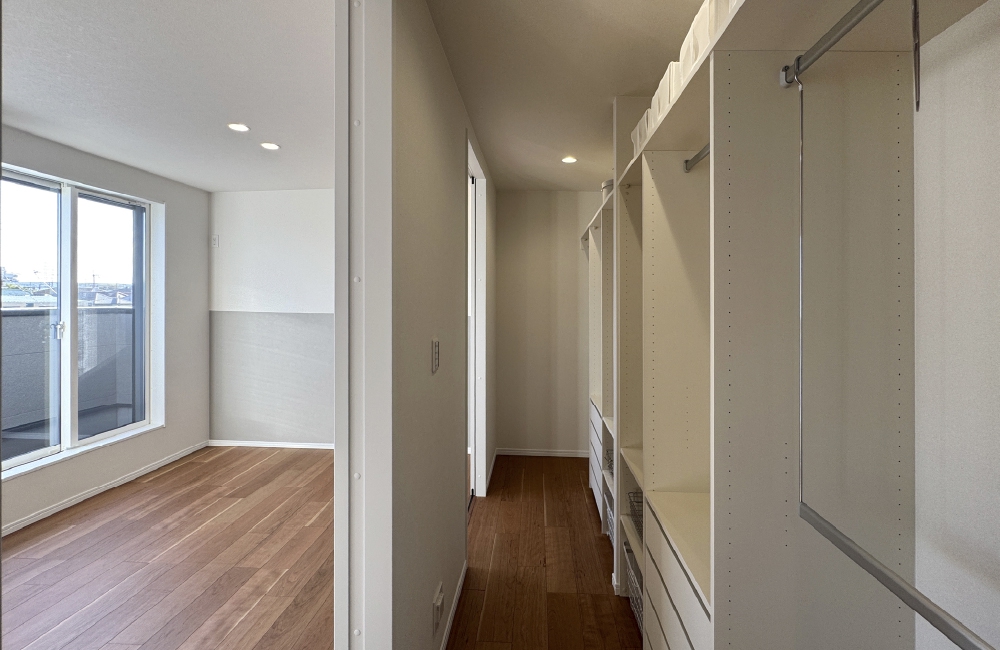 主寝室には、使い勝手の良いウォークインクローゼットを設けました。ご夫婦の衣類やバッグ、小物類までしっかり収納できるので、必要なものもスムーズに取り出せて便利です。荷物がスッキリと片付くことで、お部屋は広く感じられ、落ち着いた空間でゆったりとくつろげます。